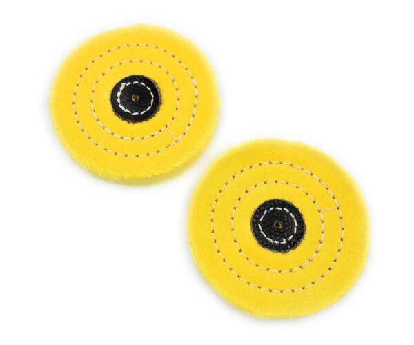 Yellow Muslin Buff, Stiched with Leather Centre, Knife Edge 4”x12 Folds, 5”x12 Folds, 6”x12 Folds.